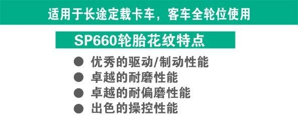全新上市的鄧祿普SP660,采用DECTES技術(shù),是一款可供卡/客車(chē)使用的全天候真空胎,適用于長(zhǎng)途定載卡/客車(chē)全輪位使用。SP660的產(chǎn)品規(guī)格有11R22.5;12R22.5;295/80R22.5三個(gè)規(guī)格,其產(chǎn)品特點(diǎn)為: