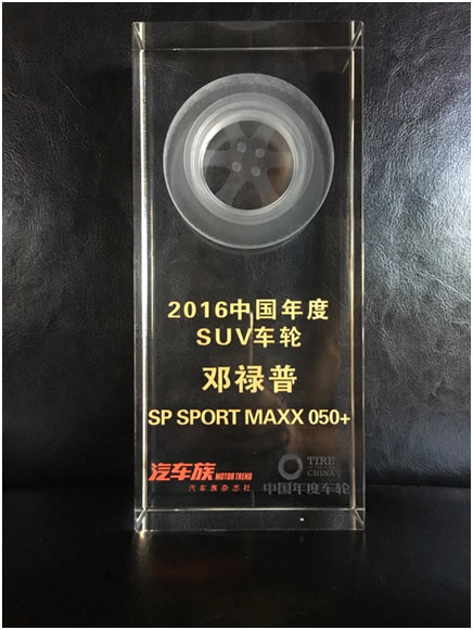 2016年8月12日,由《汽車族》主辦的“2016(第九屆)中國(guó)年度車輪頒獎(jiǎng)盛典”在上海圓滿落幕。此次盛典是中國(guó)專業(yè)汽車傳媒對(duì)輪胎產(chǎn)品全面、系統(tǒng)的年度盤(pán)點(diǎn)。鄧祿普SP SPORT MAXX 050+榮獲“2016中國(guó)年度SUV車輪”的殊榮。