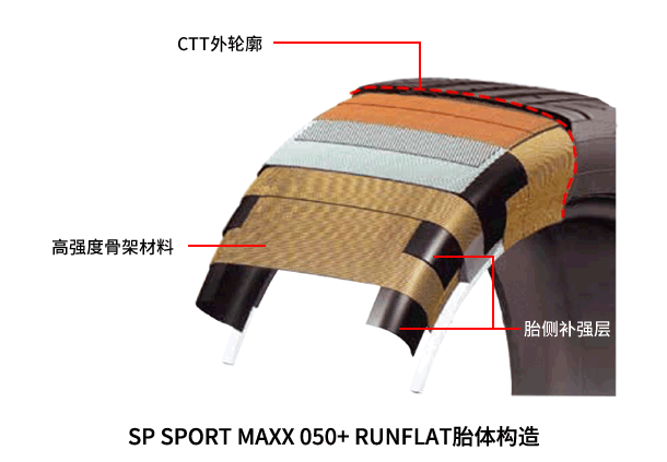 本次新上市的MAXX 050+ RUNFLAT,以“熱能控制技術(shù)”為依托,實(shí)現(xiàn)了在輪胎缺氣狀態(tài)下的安全續(xù)航。輪胎采用高強(qiáng)度的骨架材料,可有效減輕爆胎后的胎體變形,并控制胎側(cè)加固層的熱量產(chǎn)生;獨(dú)家CTT技術(shù),使用漸開(kāi)線的輪胎形狀,通過(guò)胎側(cè)補(bǔ)強(qiáng)層的設(shè)計(jì)提高缺氣保用性能,通過(guò)圓形胎面部的設(shè)計(jì)提高其他一般性能,進(jìn)一步實(shí)現(xiàn)輕量化,同時(shí)也提升了駕駛的舒適性。