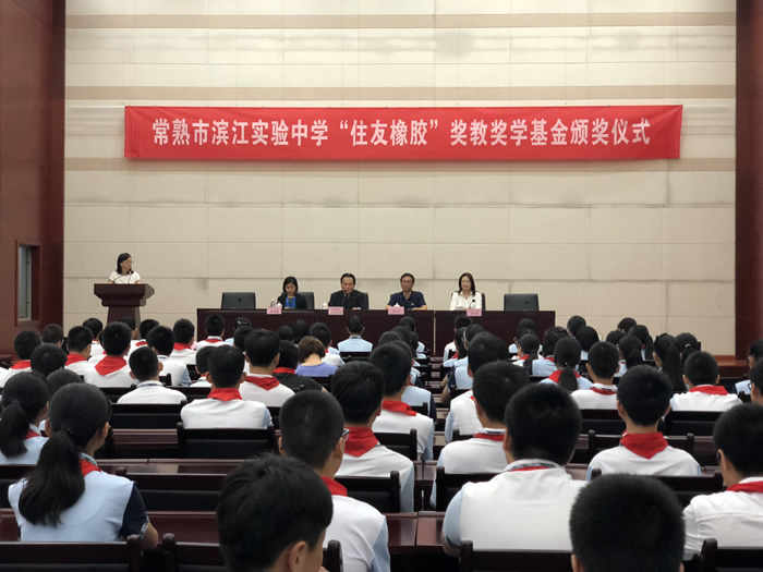 住友橡膠(中國)有限公司于2015年創(chuàng)立了“住友橡膠獎(jiǎng)教獎(jiǎng)學(xué)基金”,每年向常熟市濱江實(shí)驗(yàn)中學(xué)捐贈(zèng)5萬元人民幣,用于獎(jiǎng)勵(lì)該校優(yōu)秀師生。住友橡膠董事長山田先生在頒獎(jiǎng)致辭中表示:“獎(jiǎng)教獎(jiǎng)學(xué)基金設(shè)立的初衷,旨在獎(jiǎng)勵(lì)認(rèn)真投入教學(xué)事業(yè),精心培育青少年的各位教師,以及為不辜負(fù)老師期待,奮發(fā)向?qū)W,立志成才實(shí)現(xiàn)夢想的各位同學(xué)”。濱江實(shí)驗(yàn)中學(xué)負(fù)責(zé)人代表全校師生向住友橡膠(中國)有限公司對發(fā)展當(dāng)?shù)亟逃聵I(yè)提供的支持及幫助表達(dá)了由衷的感謝。