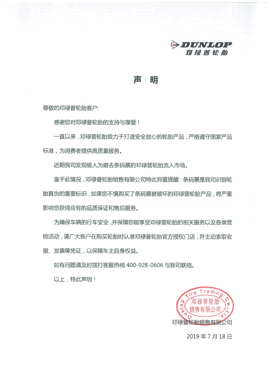 作為擁有百年歷史的全球領(lǐng)先輪胎品牌,鄧祿普秉持對(duì)消費(fèi)者積極負(fù)責(zé)的市場(chǎng)宗旨,長(zhǎng)期注重維護(hù)客戶(hù)自身權(quán)益。針對(duì)輪胎市場(chǎng)出現(xiàn)的亂象,鄧祿普輪胎向社會(huì)各界發(fā)出鄭重聲明,提醒廣大消費(fèi)者在購(gòu)買(mǎi)輪胎時(shí),應(yīng)認(rèn)準(zhǔn)鄧祿普輪胎公司官方授權(quán)的門(mén)店進(jìn)行購(gòu)買(mǎi),這樣才能充分保障消費(fèi)者自身的合法權(quán)益,不予非法商家牟利空間,與社會(huì)各界共同維護(hù)健康有序的輪胎市場(chǎng)環(huán)境。