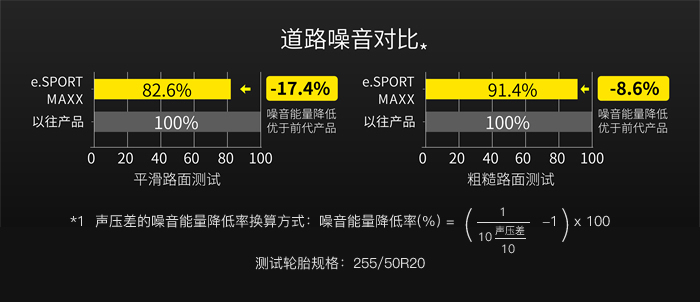 新品采用新一代變性聚合物搭配壓力控制技術(shù),減少行駛過(guò)程中不必要發(fā)熱,減少行駛過(guò)程中能量損耗,帶來(lái)理想的低滾阻性能和耐磨耗性能。同時(shí)為了達(dá)到人車(chē)合一的從容“靜界”,采用降噪花紋設(shè)計(jì),并搭載住友橡膠研發(fā)的SILENT CORE降噪內(nèi)核技術(shù)。較以往產(chǎn)品相比,新品能夠有效緩解新能源汽車(chē)的胎噪問(wèn)題。通過(guò)道路噪音對(duì)比實(shí)驗(yàn)結(jié)果顯示*1,在平滑路面表現(xiàn)上,e. SPORT MAXX的降噪效果高于以往產(chǎn)品17.4%;在更加嚴(yán)苛的粗糙路面表現(xiàn)上則高出8.6%,全面遏制噪音,展現(xiàn)了出色的降噪性能。