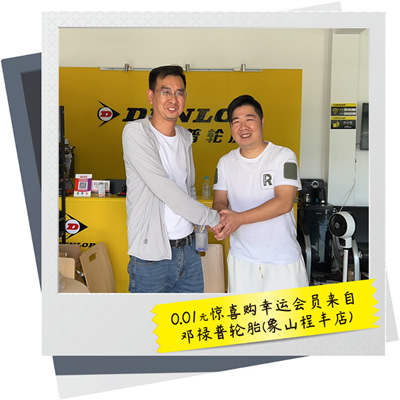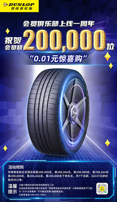 為答謝會(huì)員的支持,鄧祿普輪胎特別推出寵粉周年慶活動(dòng) —“0.01元驚喜購(gòu)”。 對(duì)鄧祿普輪胎會(huì)員俱樂(lè)部第200,000名、第200,066名、第200,088名、第200,666名、第200,888名、第206,666名、第208,888名下單車(chē)主,提供了以僅需0.01元的價(jià)格支付訂單的特別禮遇,共7個(gè)名額。