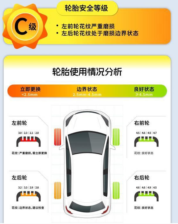 據(jù)輪胎花紋深度國家法定標(biāo)準(zhǔn)規(guī)定,輪胎花紋深度大于4.5mm被視為良好狀態(tài);2.5-4.5mm被視為臨界狀態(tài);一旦花紋深度低于2.5mm,輪胎便需要更換。值得注意的是,1.6mm為輪胎花紋的國家法定標(biāo)準(zhǔn),當(dāng)花紋深度達到極限值1.6mm時,車輛必須立即更換輪胎,以確保行車安全。